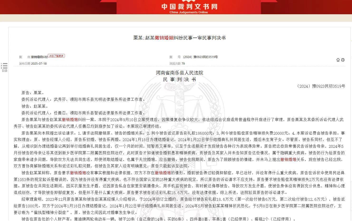 得知真相后,栗先生和家人几乎崩溃了。2024年6月25日,他正式向南乐县人民法院提起诉讼,请求撤销婚姻并返还彩礼。栗先生向记者提供的裁判文书载明,2023年12月原告栗某和被告赵某某经媒人介绍相识,于2024年初订立婚约,原告给付被告彩礼款18.6万元,被告返给原告1000元。双方于2024年1月18日办理结婚登记,2024年1月22日举行结婚典礼并同居生活。2024年5月被告赵某某精神状况恶化,于5月8日在新乡医学院第二附属医院住院治疗,主要诊断为“偏执型精神分裂症”,原、被告之间因此对婚事发生争议。另查明,被告赵某某近年多次因精神疾病住院,多家医院诊断其为“精神分裂症”。